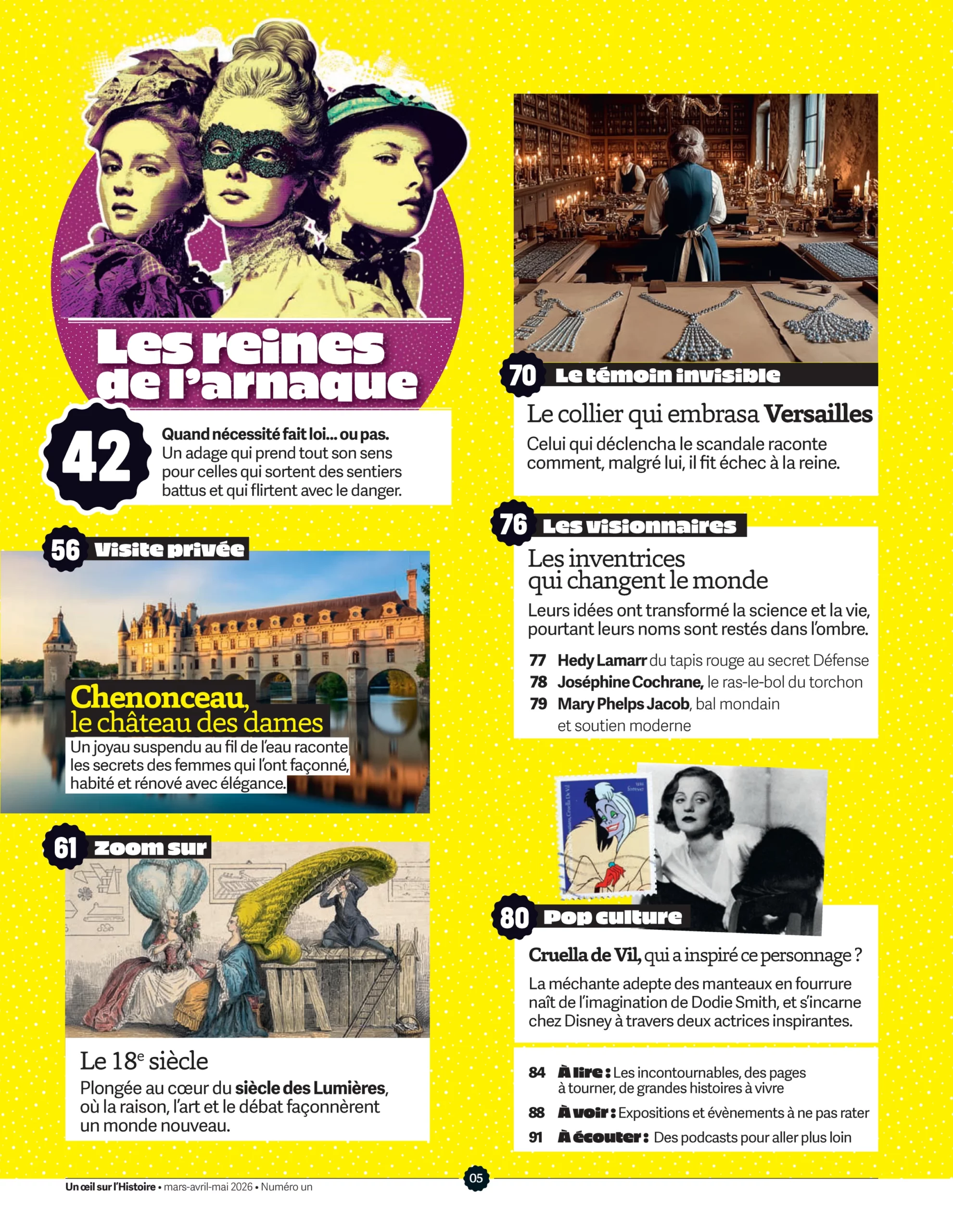 Ce numéro met en lumière des femmes qu’on ne range pas sagement dans les marges : pirates, voleuses, arnaqueuses, empoisonneuses. Ni saintes ni caricatures, mais actrices à part entière d’un monde qui ne leur faisait pas de place. Nous donnons aussi la parole au bijou le plus célèbre du XVIIIe siècle, le collier de l’affaire qui éclaboussa la cour et Marie-Antoinette.